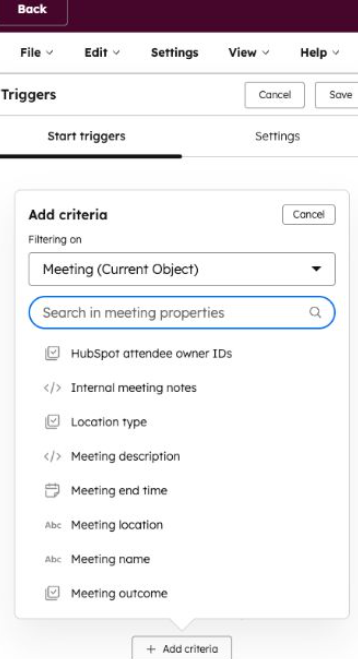 (iii) Select the relevant meeting object and property to design the automation revolving the HubSpot meetings;